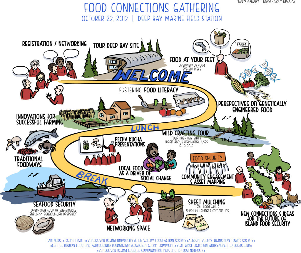 As a 10-year resident of Vancouver Island, I’m inspired by the passion and collaboration of the Food Connections Gathering — the visual summary above is a great overview! If you’re interested in food security on the Island, visit any of the following organizations: