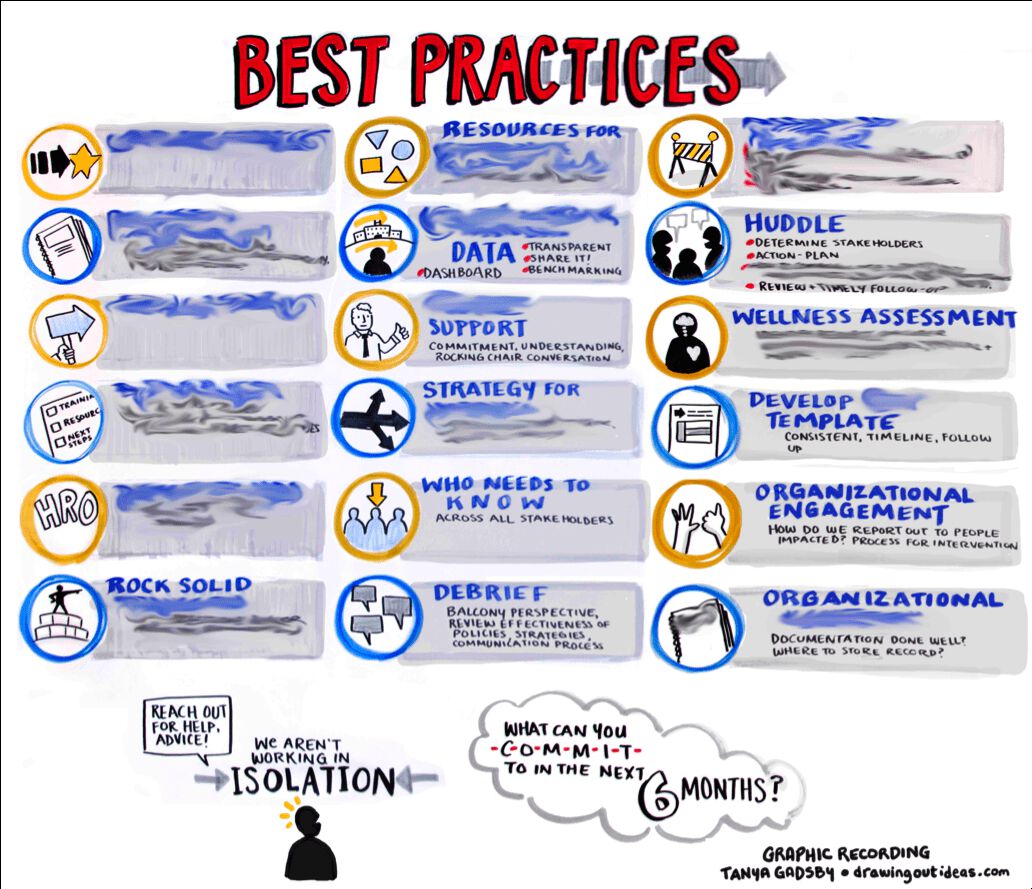 Below: This client preferred organized icons and structured text. Graphic recording by Tanya Gadsby (confidential info blurred)