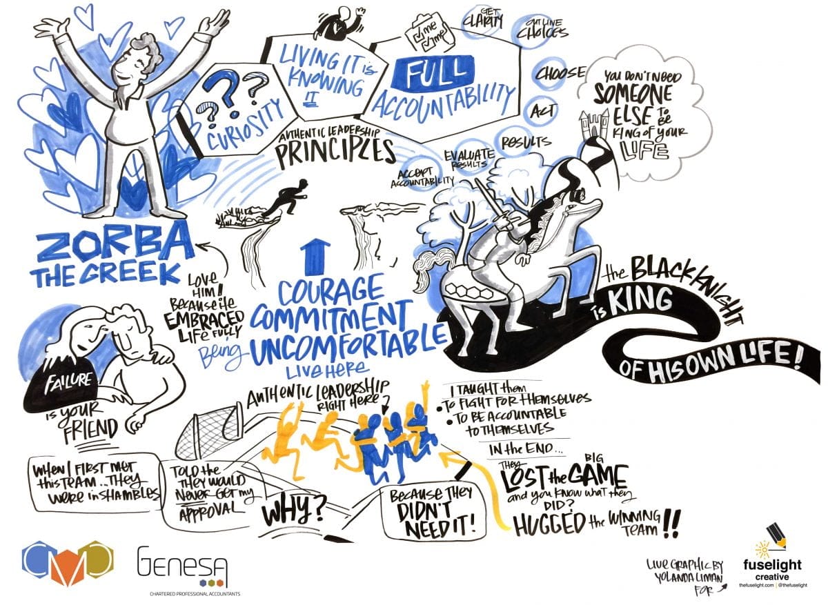 For example, some of our work with engineers is highly technical. These folks appreciate accurate images of their products, structured diagrams, and clean text. On the other hand, our work at high-energy motivational conferences requires a big, bold style to the graphics, and lots of playfulness and humour.