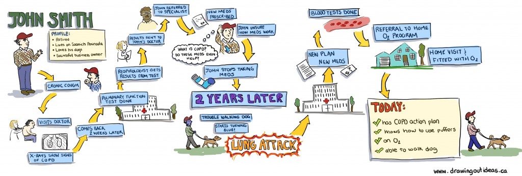 Graphic recording the journey ensures clear communication, especially when dealing with highly complex processes and with many people providing input. Creating a visual map is crucial in maintaining the group’s focus in order to thoroughly map the journey. It’s also important that patients feel they can express their personal stories in a safe environment where their voice is being heard. Graphic recording helps ensure patients feel validated by seeing their words displayed clearly through images. Graphic recording also captures the tone of what’s being said (or not said!).
