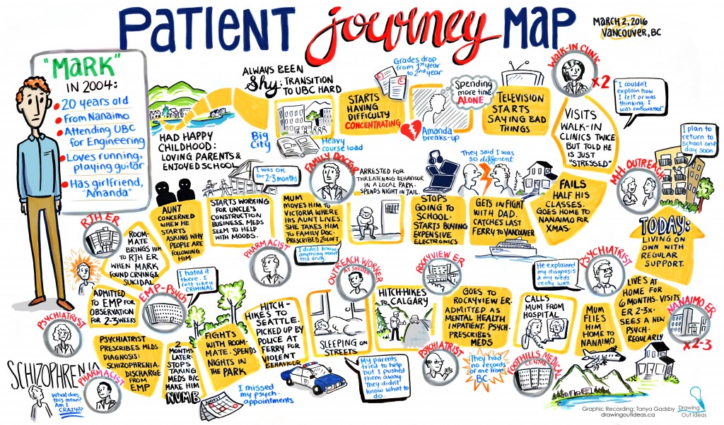 Journey mapping is used in a variety of industries, including healthcare. Patient Journey Mapping brings together physicians, health professionals, and patients for a day-long session of mapping the patient experience. The focus is the patient and plotting their healthcare path through diagnosis, treatment, discharge home, and back again. As the patient journey is mapped, gaps in care are identified and wait times highlighted.