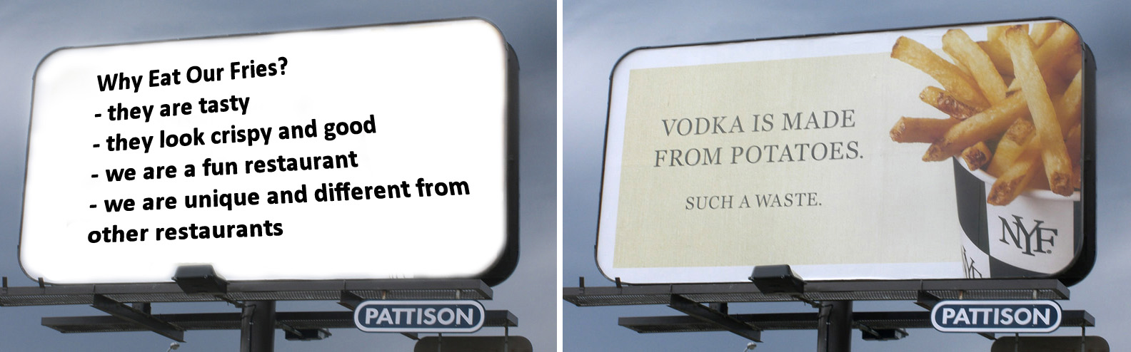 Billboards are designed to convey an idea or message quickly. You wouldn’t see a restaurant billboard with long-winded bullet points about why you should eat there.