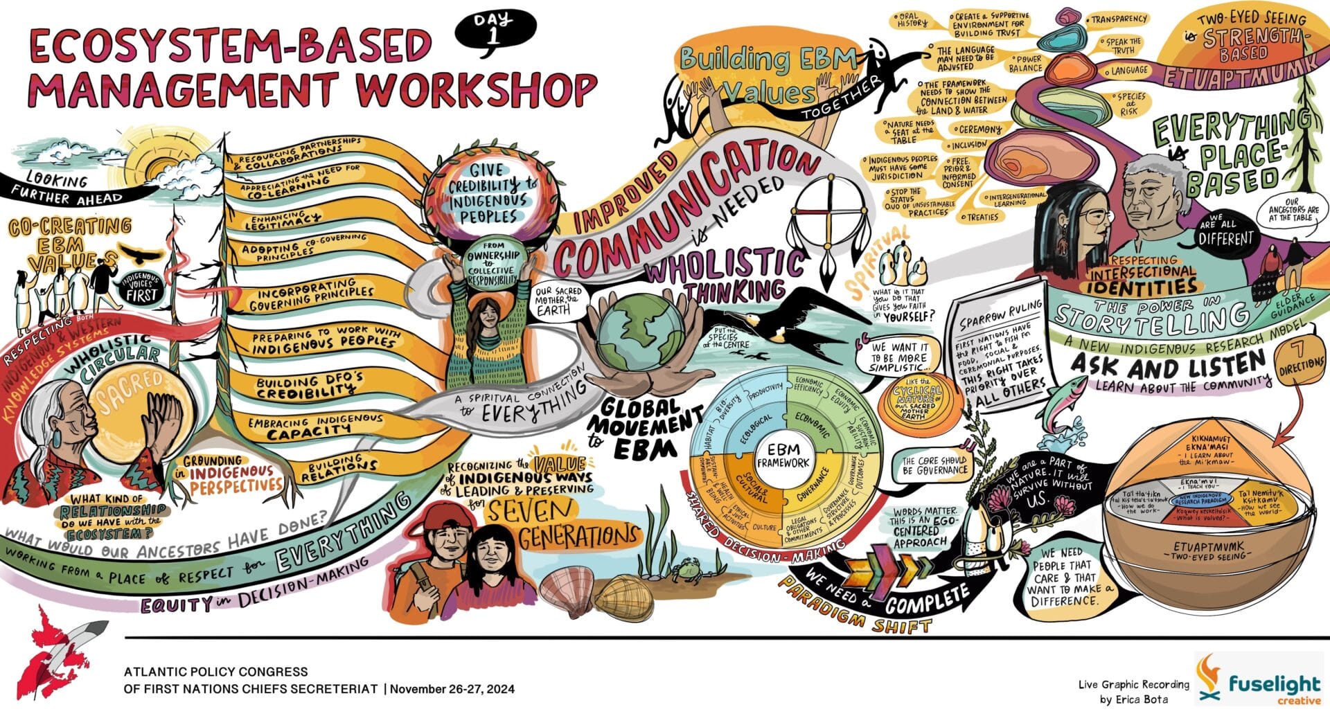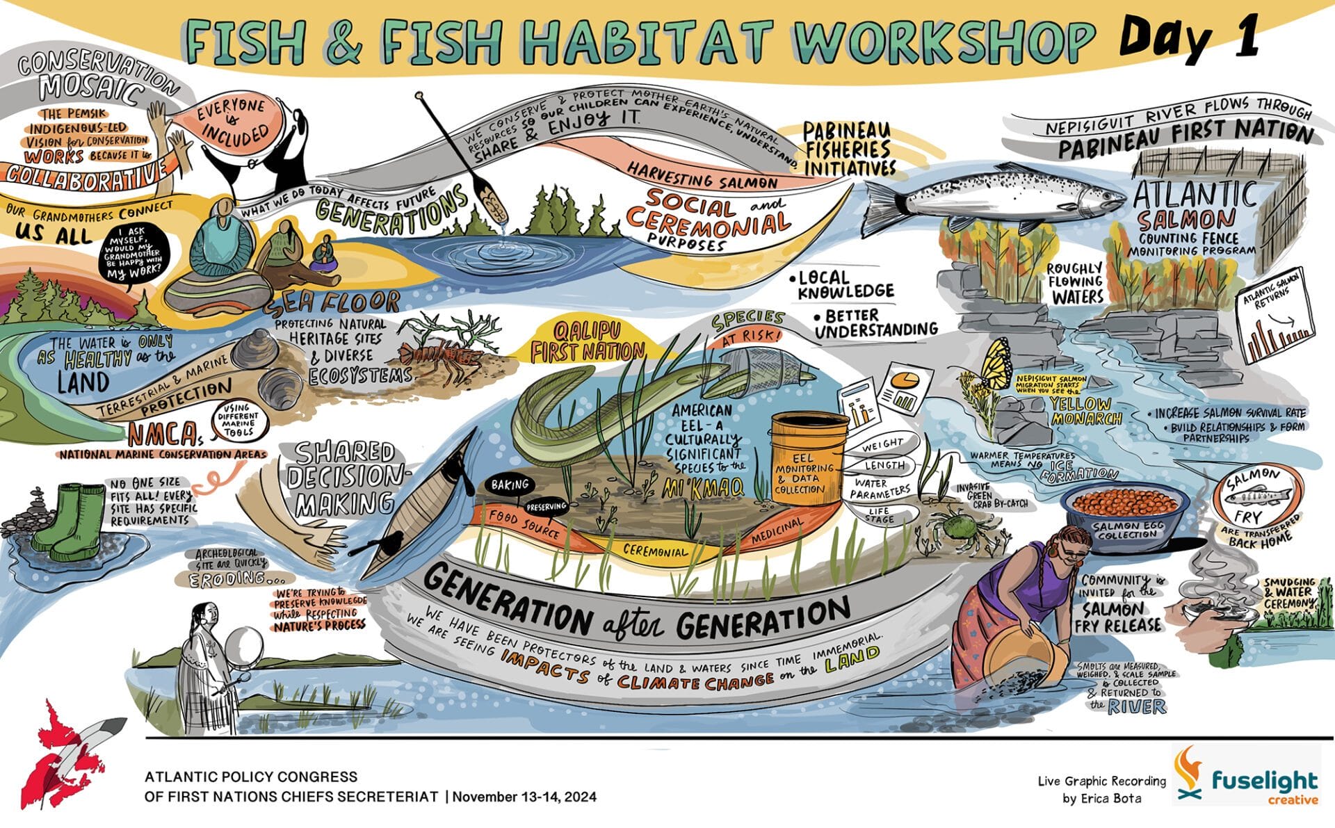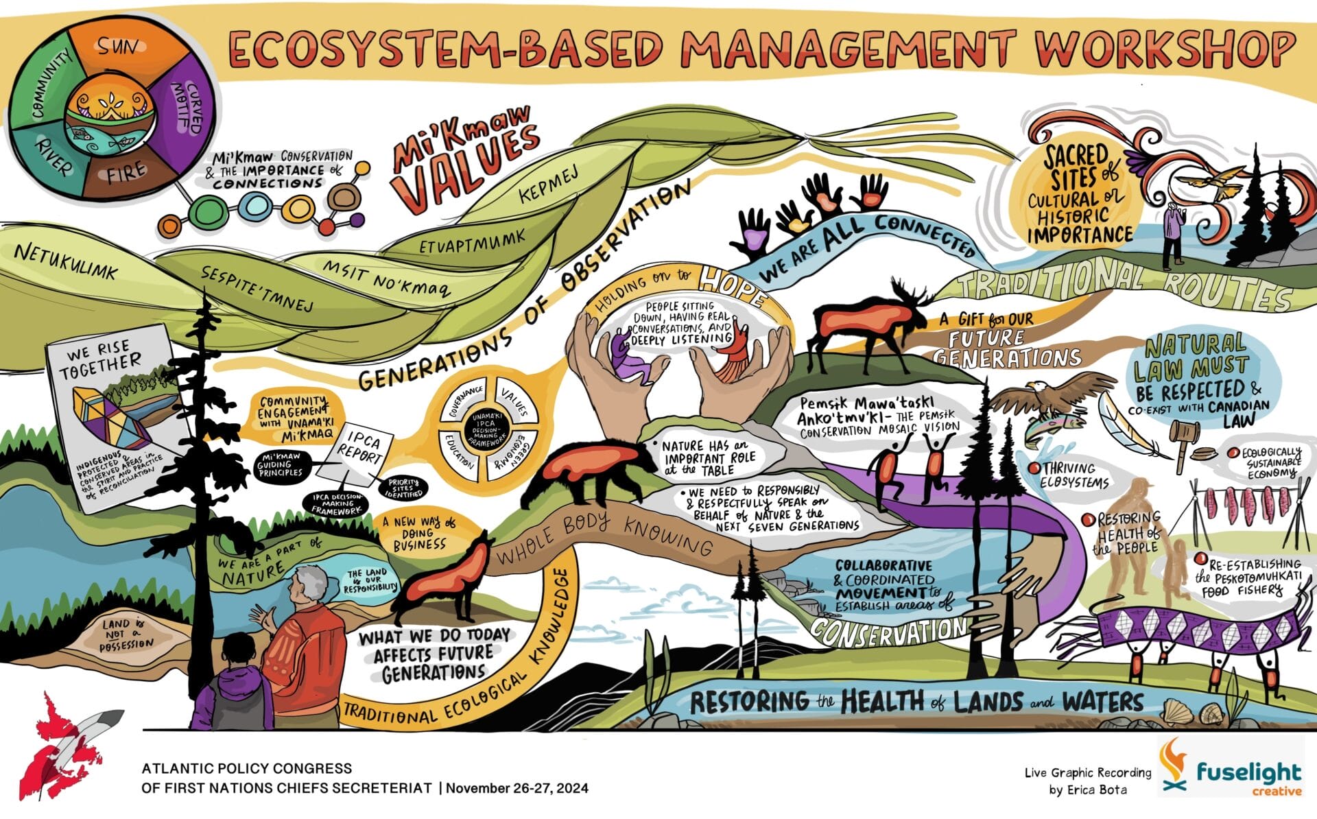 We supported a multi-day online gathering of the Atlantic Policy Congress to visually map out their priorities, challenges, and next steps for aquatic species and ecosystem management. Centring Indigenous knowledge and leadership is key to sustainable ecosystems, and it will take everyone’s commitment to shared values to bring this work forward.