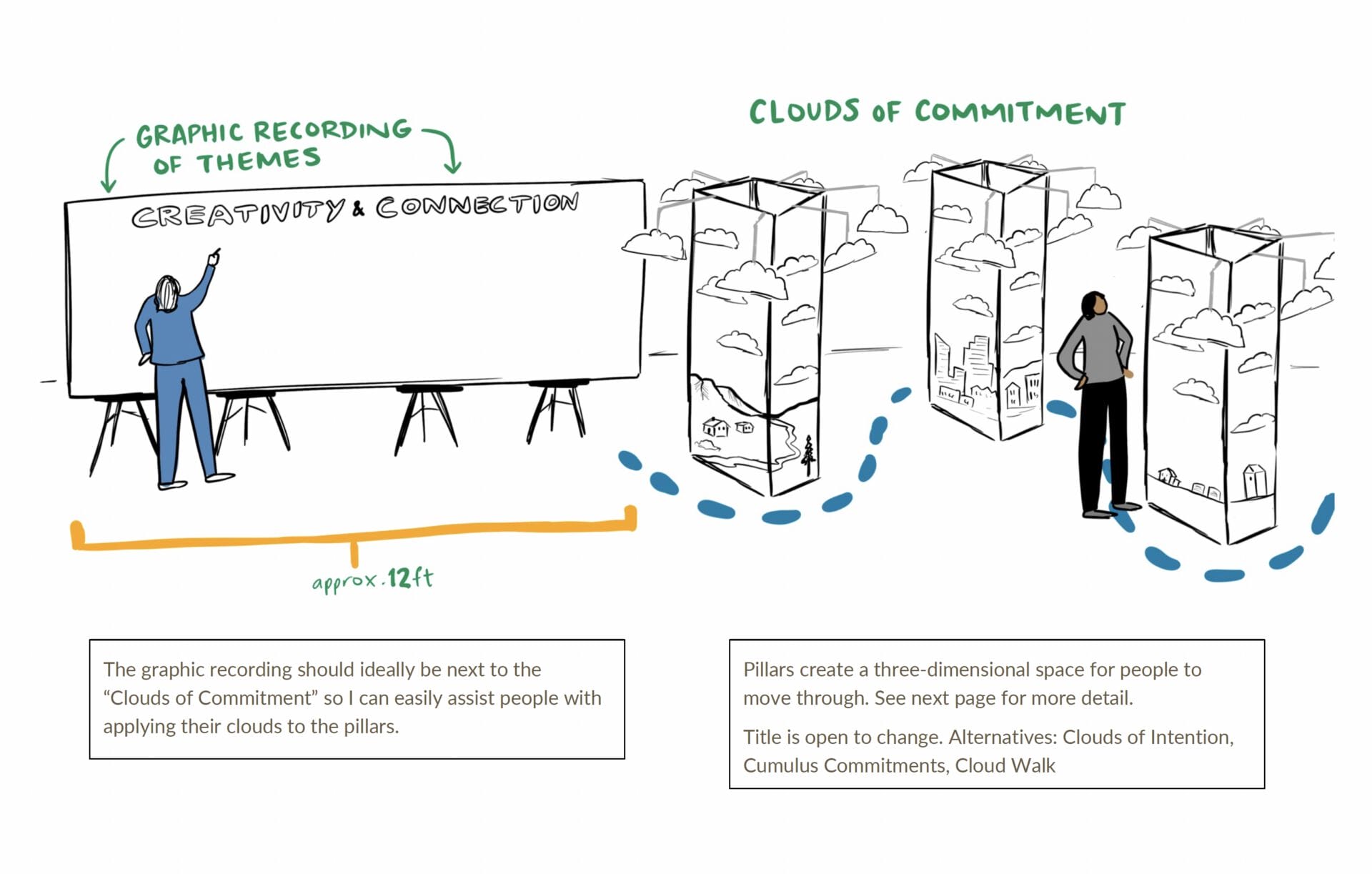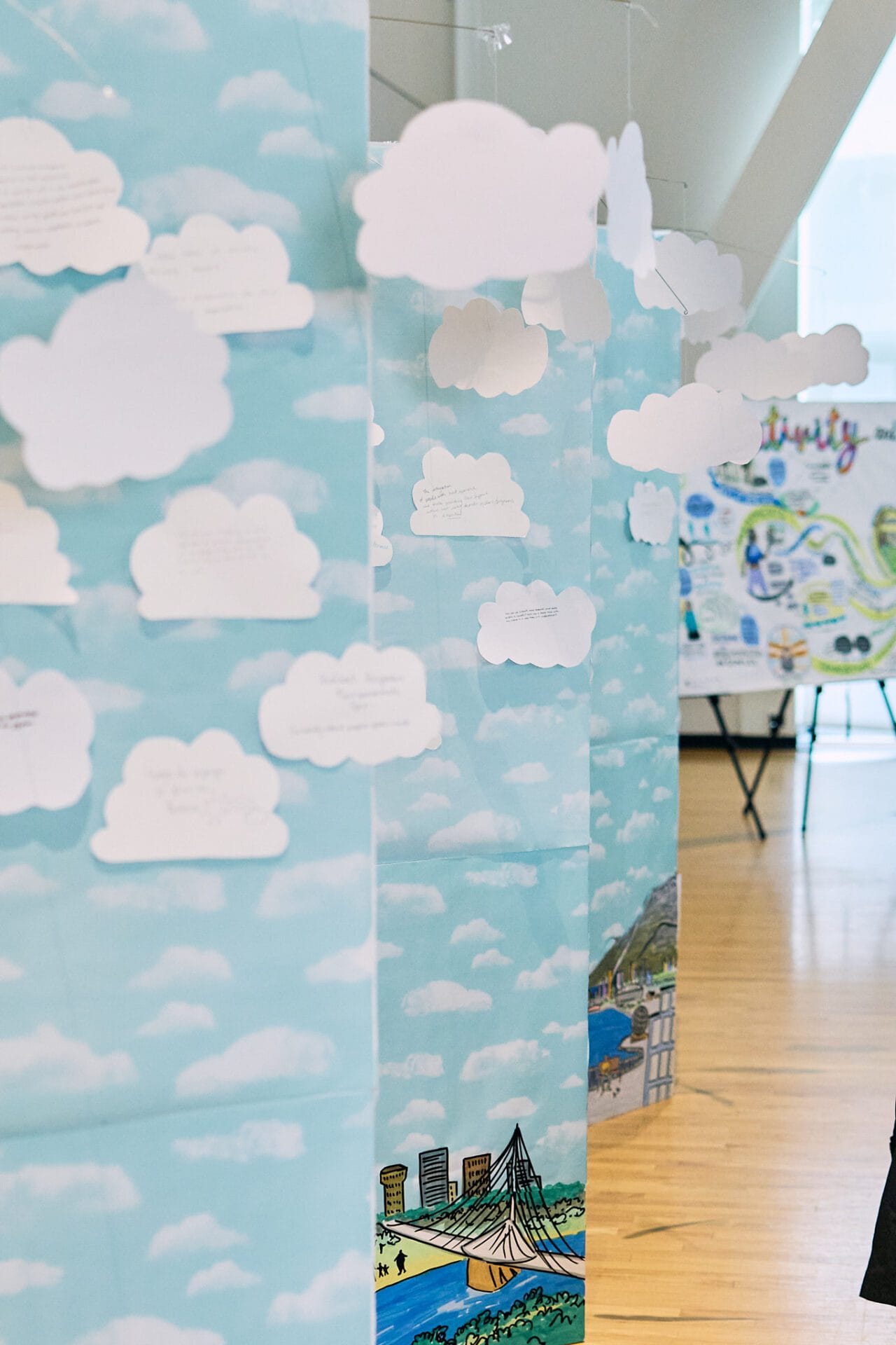 We met with the EDAC team in the weeks leading up to the conference to discuss metaphors, themes, and an approach that would work best for their audience. We mocked up a proposal for a “walk among the clouds of commitment” in the form of 8ft tall pillars people could weave through to see everyone’s commitments. Illustrated scenes from across Canada would form the base of the pillars, to represent the diversity of regions and people EDAC’s work covers. See a video of the walk through the clouds.