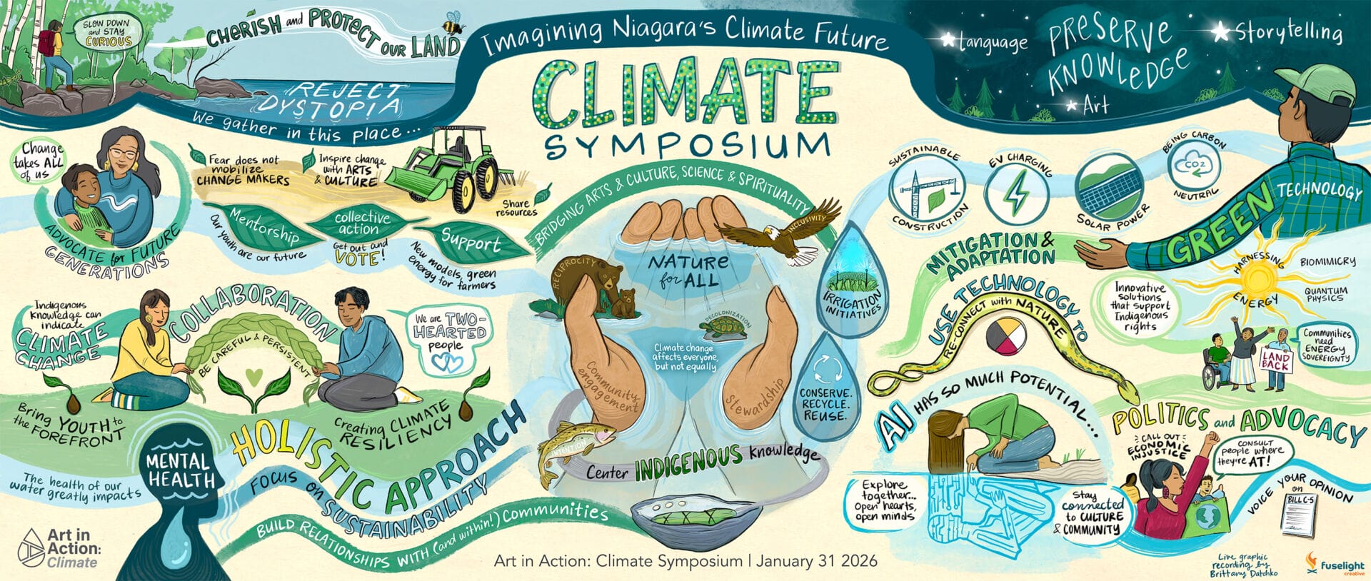 At the Art in Action (AiA) Climate Symposium hosted by the FirstOntario Performing Arts Centre, a diverse community of artists, scientists, and Indigenous knowledge holders gathered to imagine a resilient future for the Niagara region. Over the course of a full day, graphic recorder Brittany captured a series of dynamic sessions—ranging from Haudenosaunee perspectives on water sovereignty to the intersection of generative AI and climate change.