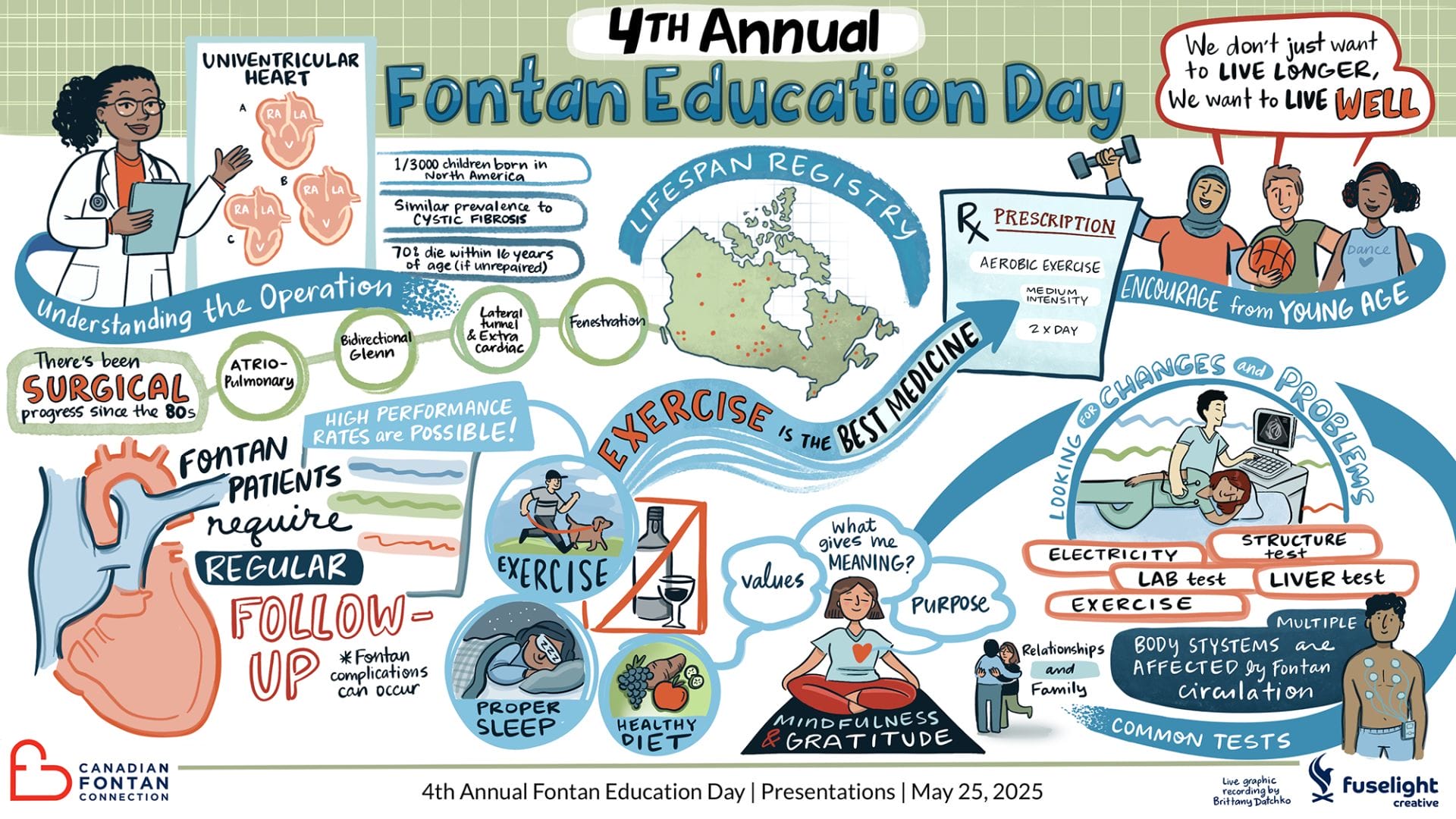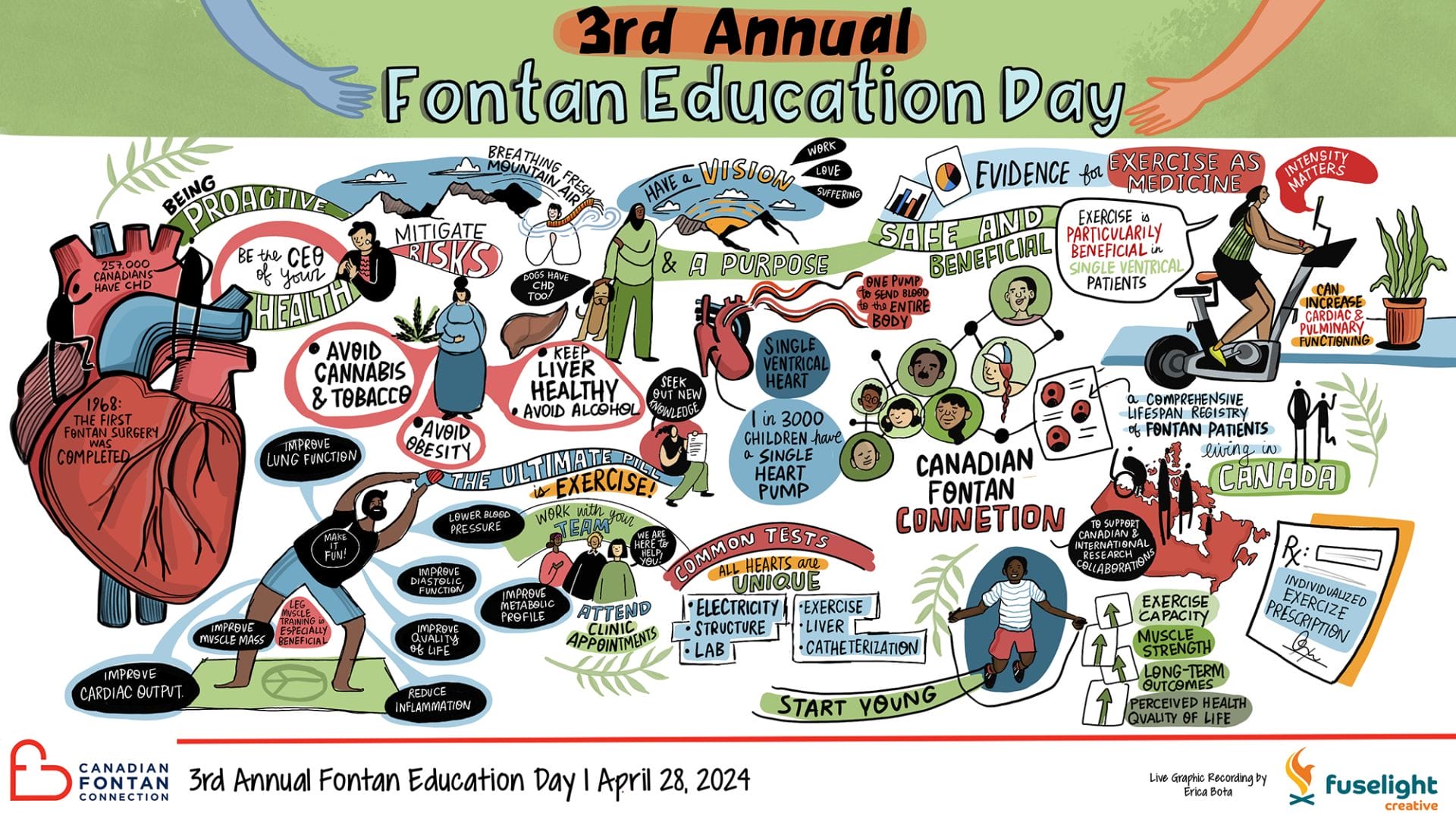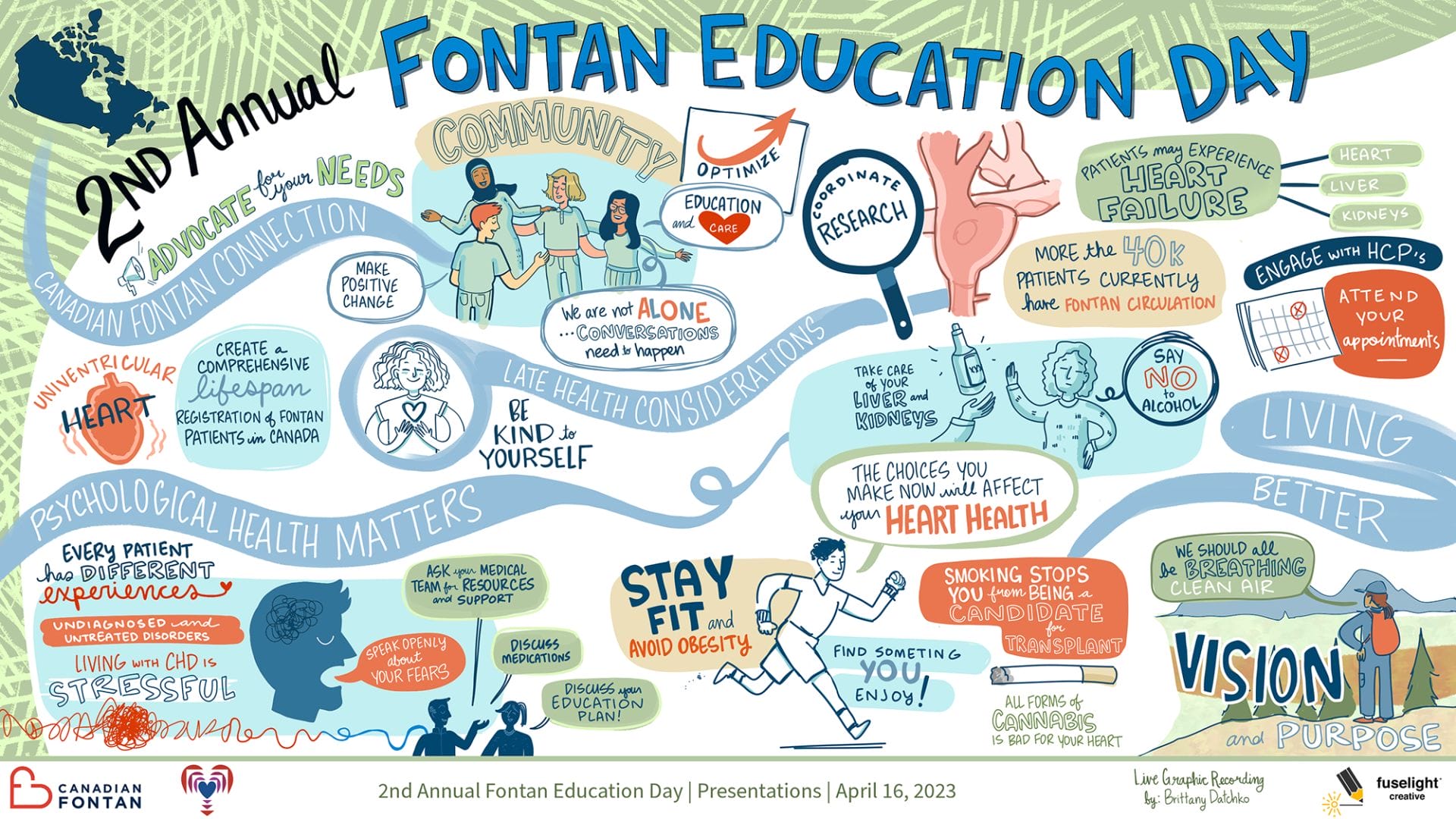 We’ve had the pleasure of supporting four years (2022-2025) of Fontan Education Day, hosted by the Canadian Fontan Connection. This virtual series brings together Fontan patients, researchers, and clinicians to discuss best practices, ideas for improvement, and current research. The Fuselight team included a tech host to support the virtual gathering, and a live graphic illustrator to capture the ideas in real time.