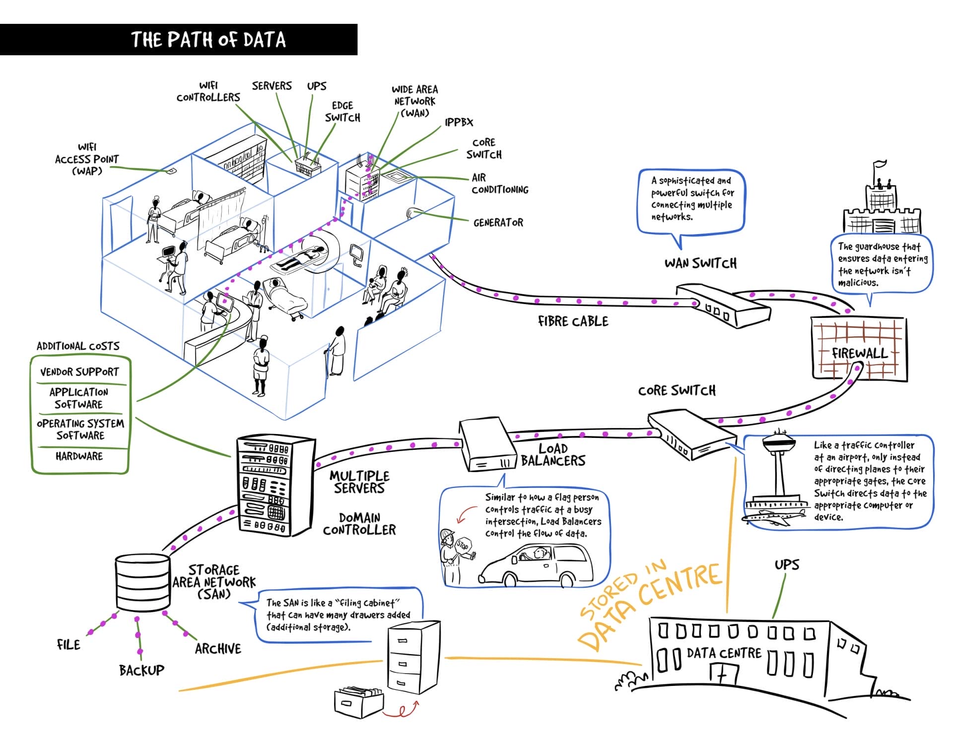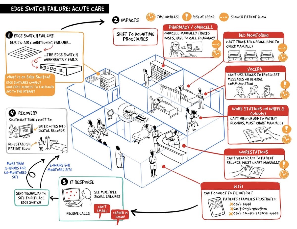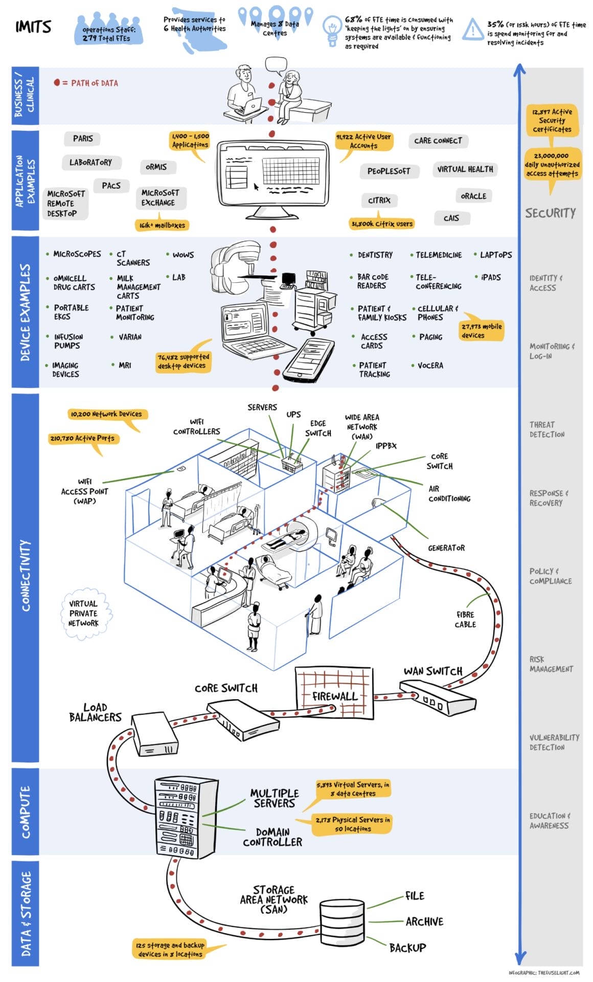 The IMITS team at the Provincial Health Services Authority (PHSA) approached us to help them better communicate the complex technology infrastructure in the health system. They needed clear visual maps to share with decision makers and the board so they’d better understand the importance of technology investments and what happens in different outage scenarios.