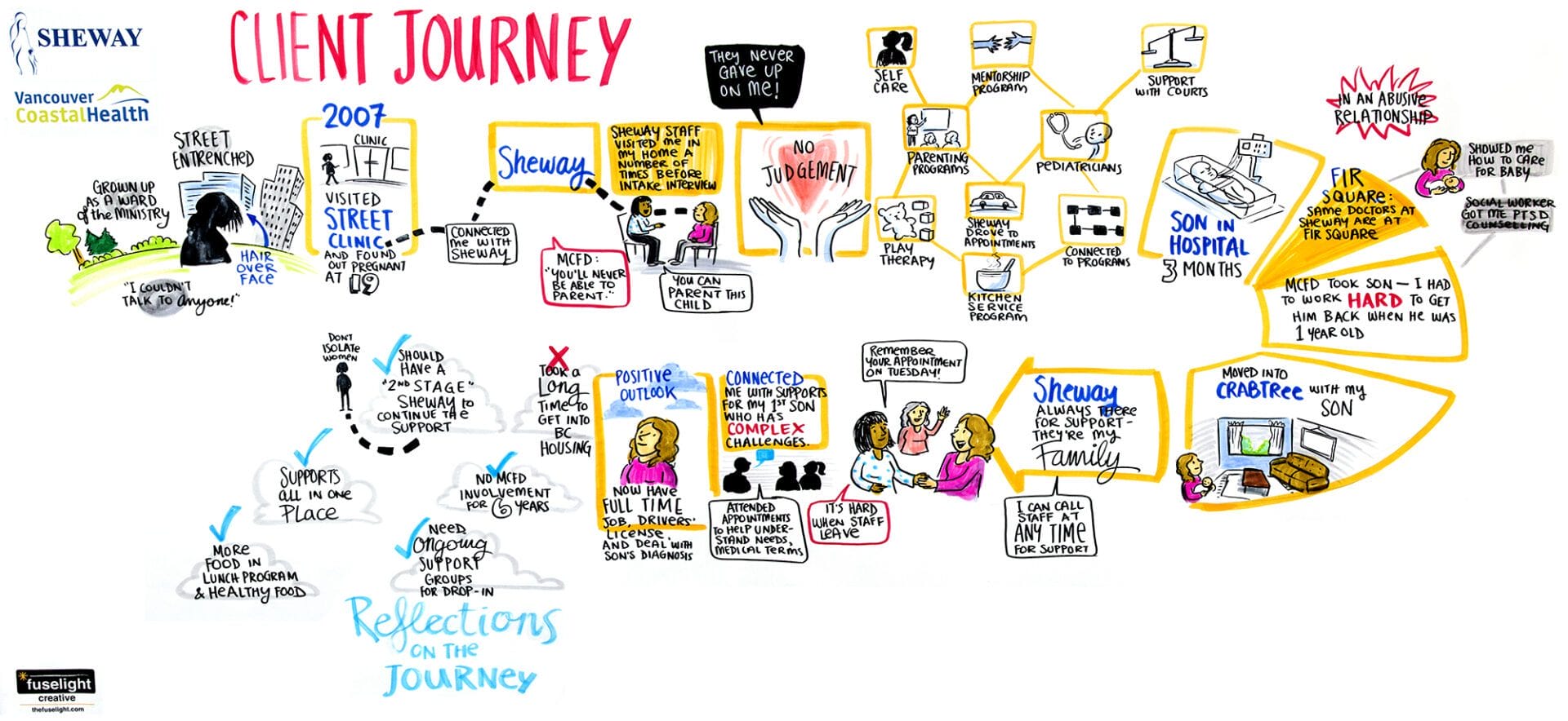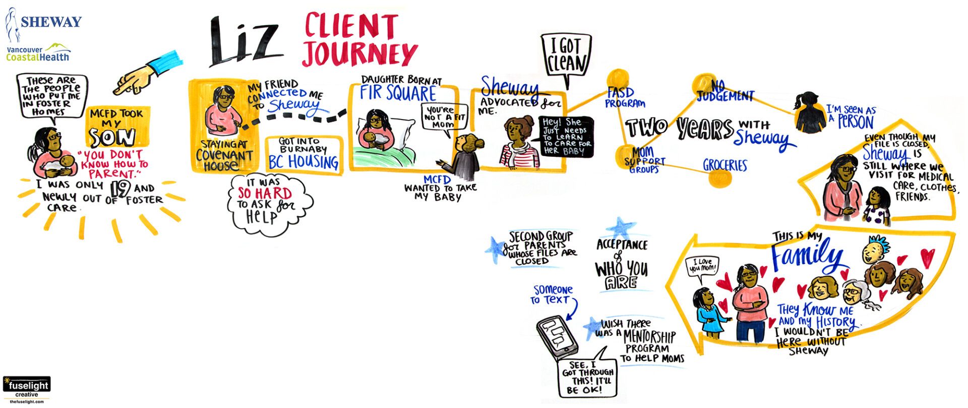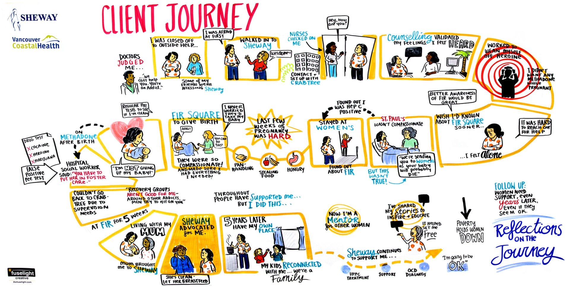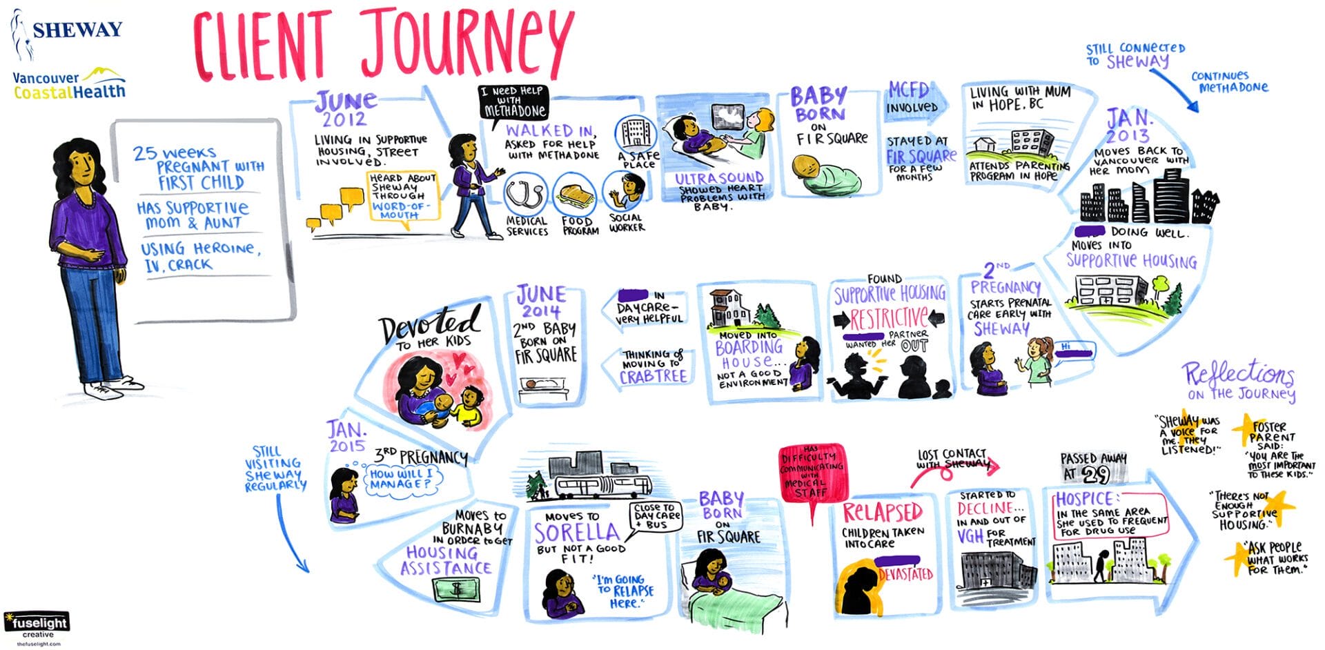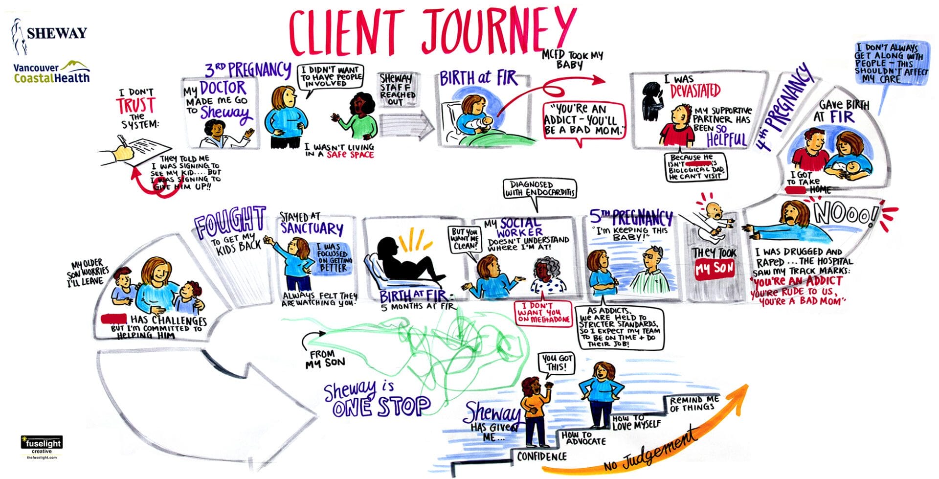 Over a series of nine one-on-one sessions, we mapped out individual journeys through pregnancy and parenthood of people living with addiction in the downtown eastside of Vancouver. Each session had a graphic facilitator, a counsellor (who acted as facilitator for prompting questions), the client sharing their story, and the client’s chosen support person (such as a friend or family member, if desired). This helped keep the space intimate and confidential so the client would feel more comfortable sharing openly.