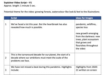 Excerpt from an explainer video script listing narration in one column and potential visuals in a parallel column.